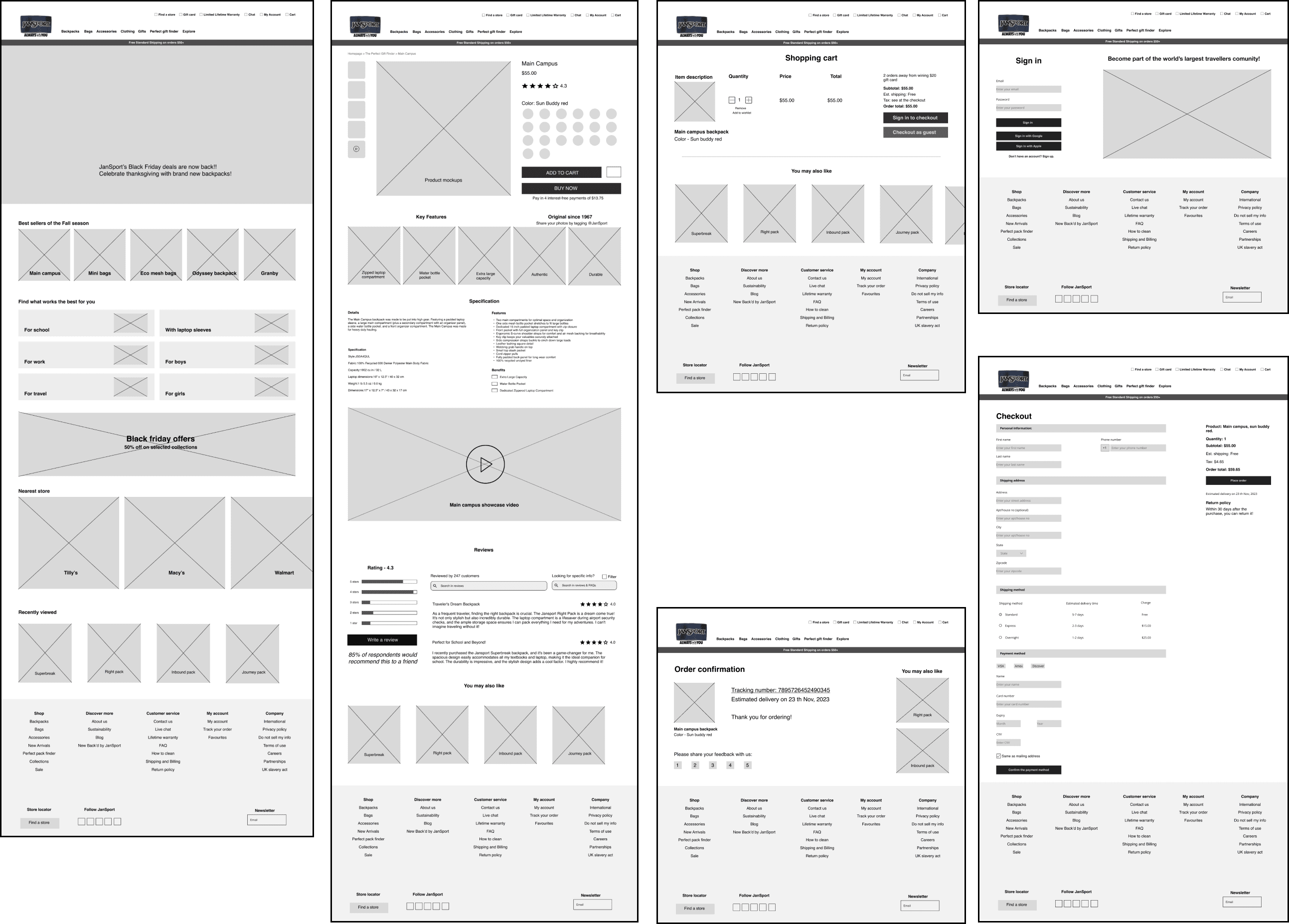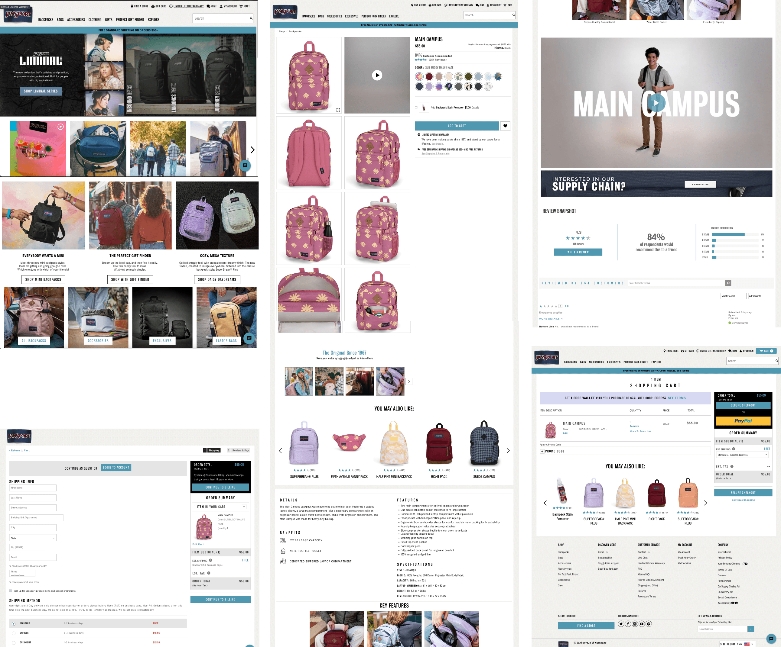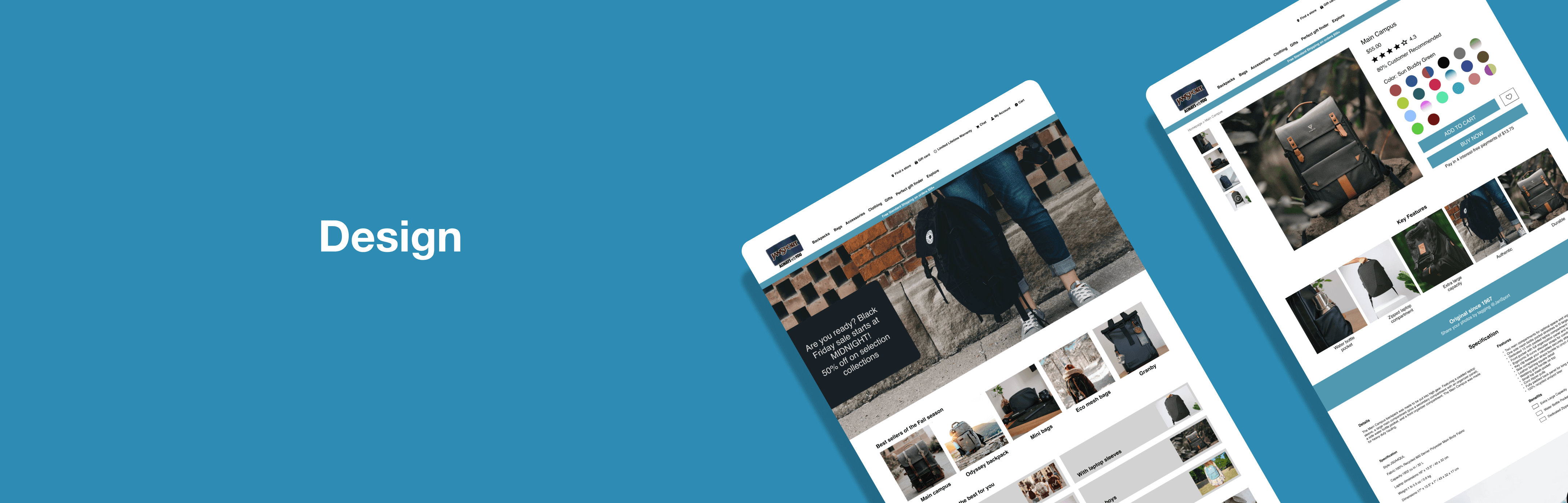 JanSport is an American company that manufactures and retails backpacks, bags, and outdoor gear. They cater to a wide range of masses namely, students, professionals, outdoor enthusiasts, and travelers. Their website was re-design to improve the conversion rate, and the whole user experience of it, to achieve more online revenue. Competitive analysis and user research was conducted to produce high-fidelity wireframes as solutions.