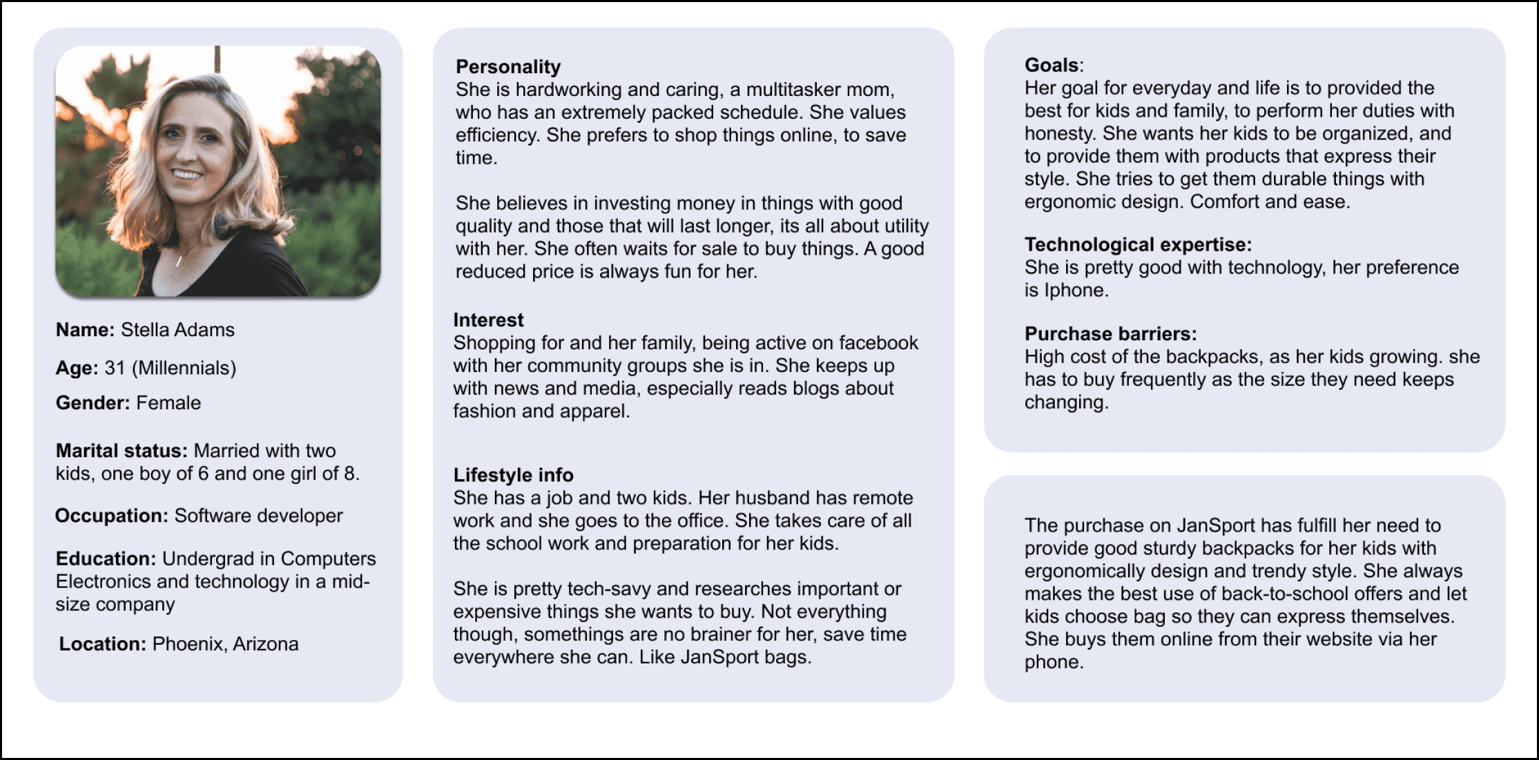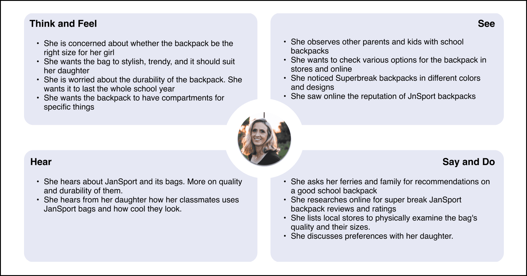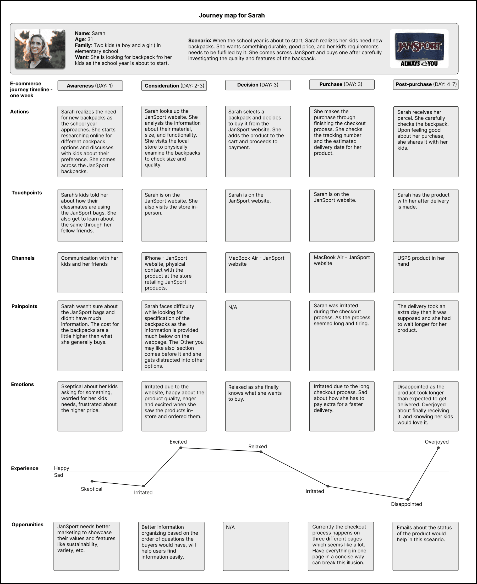 The persona, empathy map, and journey map is based on a married woman in her thirties. She has two kids, one boy and one girl. She is looking to buy a new backpack for her kids. She is based on the current user audience discovered in user research. Following analysis about the persona catches a glimpse of the audience and helps set benchmarks in not only usability and accessibility, but also in user’s interest, emotional investment, and motivations.